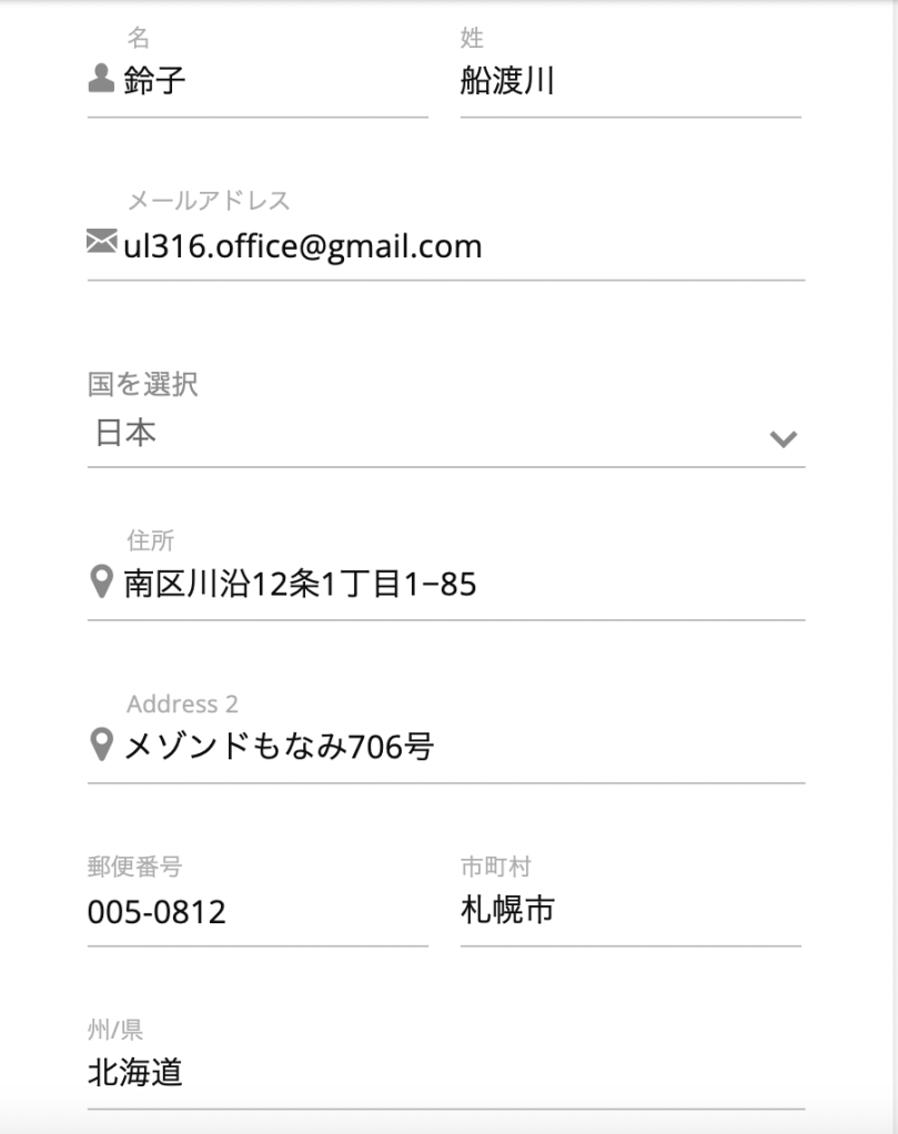 <注>入力順に気をつけてください!お名前は、名、姓の順番でご入力ください。[住所]に番地、[Address 2]に建物の名前以降をご入力ください。[州/県]に都道府県をご入力ください。