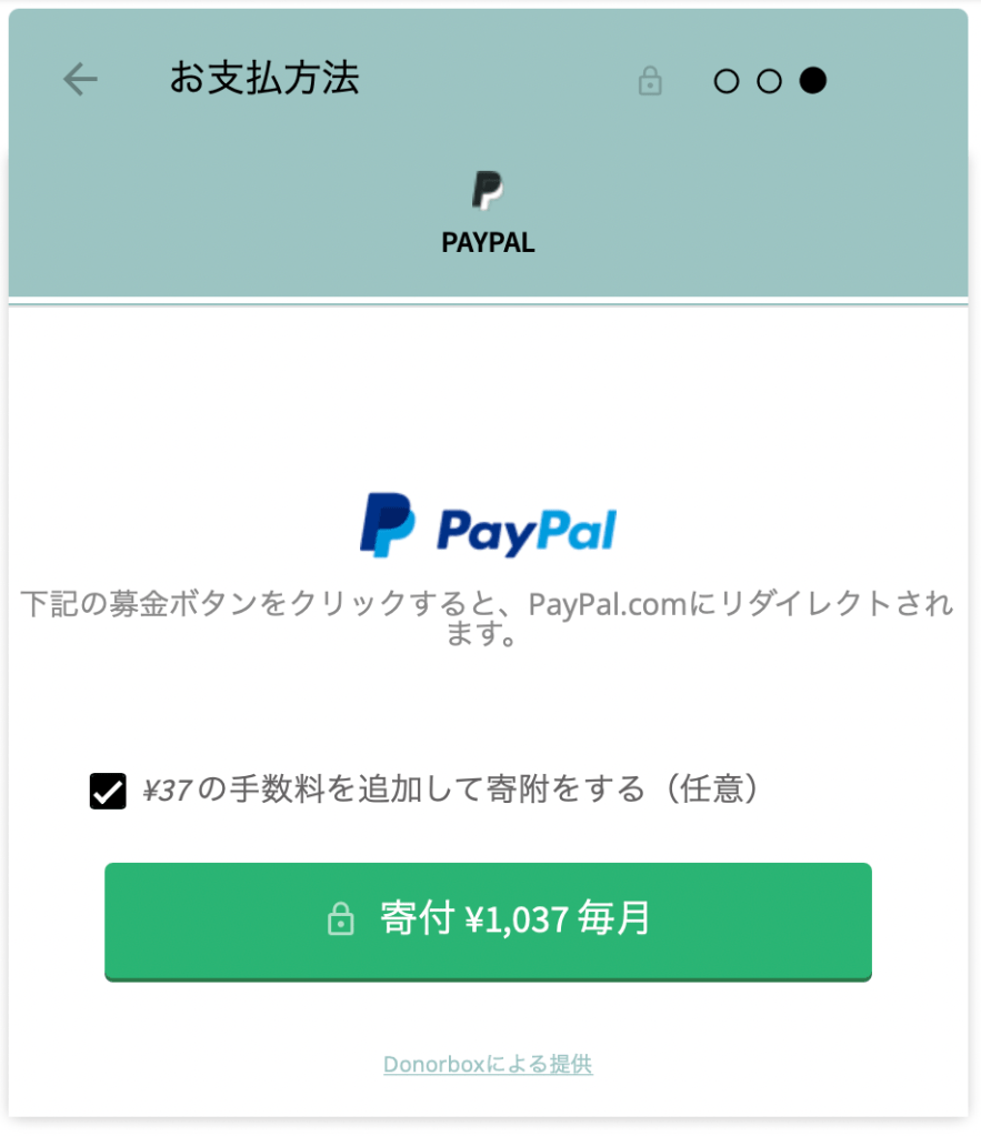 次の画面に進み、手数料をお支払いくださるかどうかを選択し、緑色の寄付ボタンを押してください。
