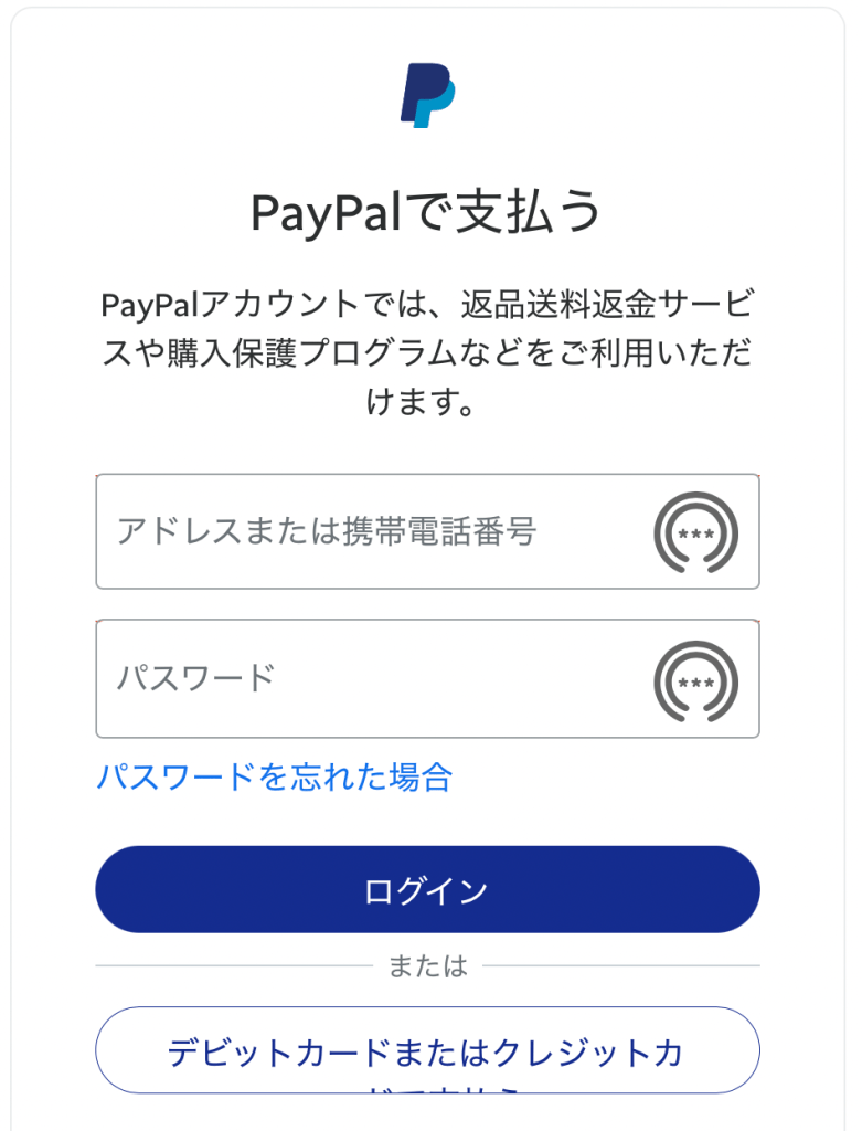 次の画面に進み、Paypalアカウントをお持ちの方はログインしてください。お持ちでない方は、下のクレジットカードで支払うボタンを押してください。